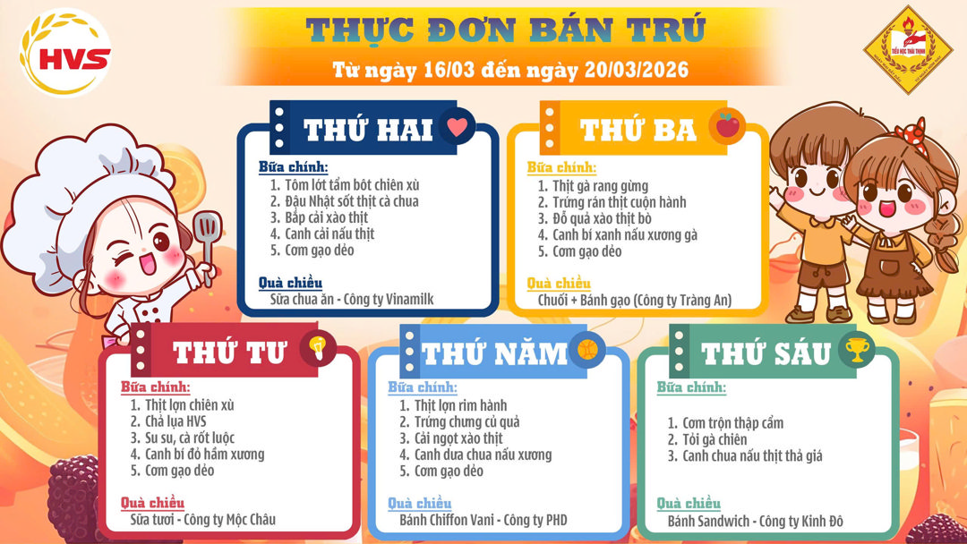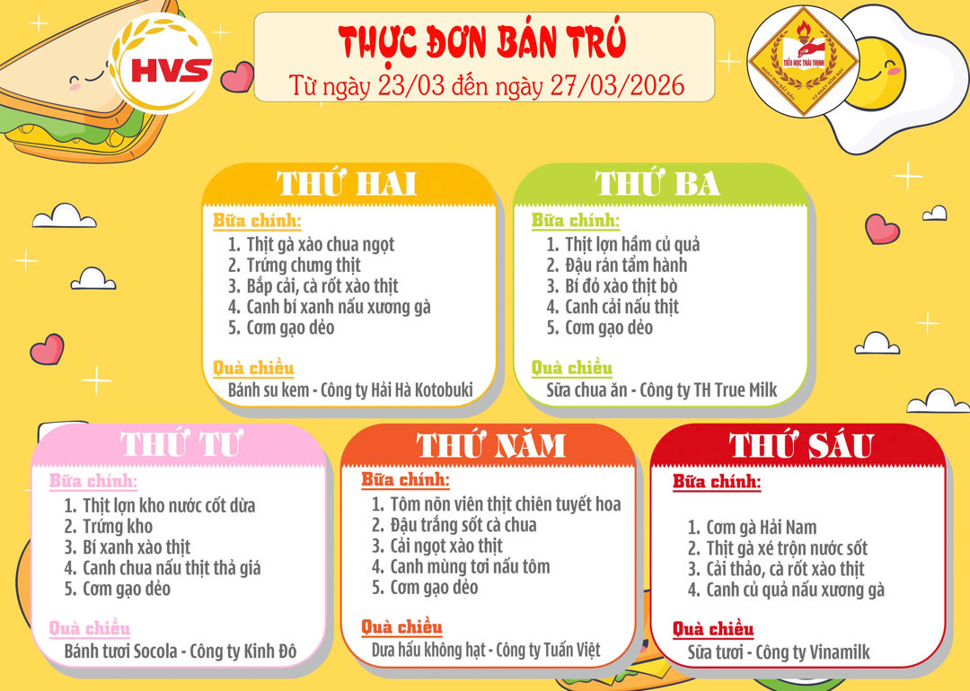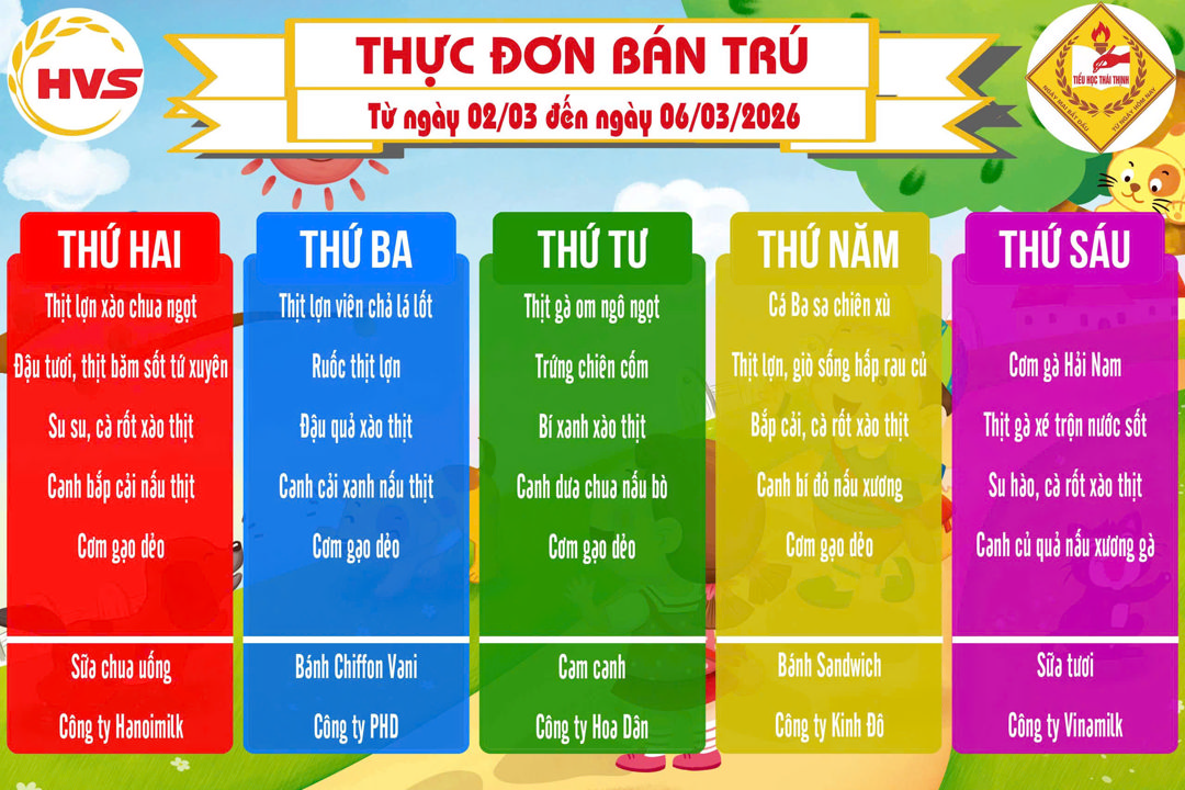 Thực đơn bán trú từ ngày 02/03 đến 27/ 03/ 2026
