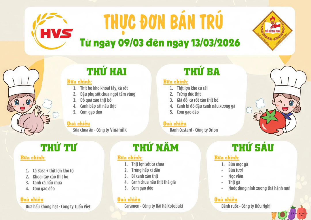 Trường Tiểu học Thái Thịnh kính gửi quý PHHS thực đơn bán trú từ ngày 27/10 đến 31/10/2025. Trân trọng!